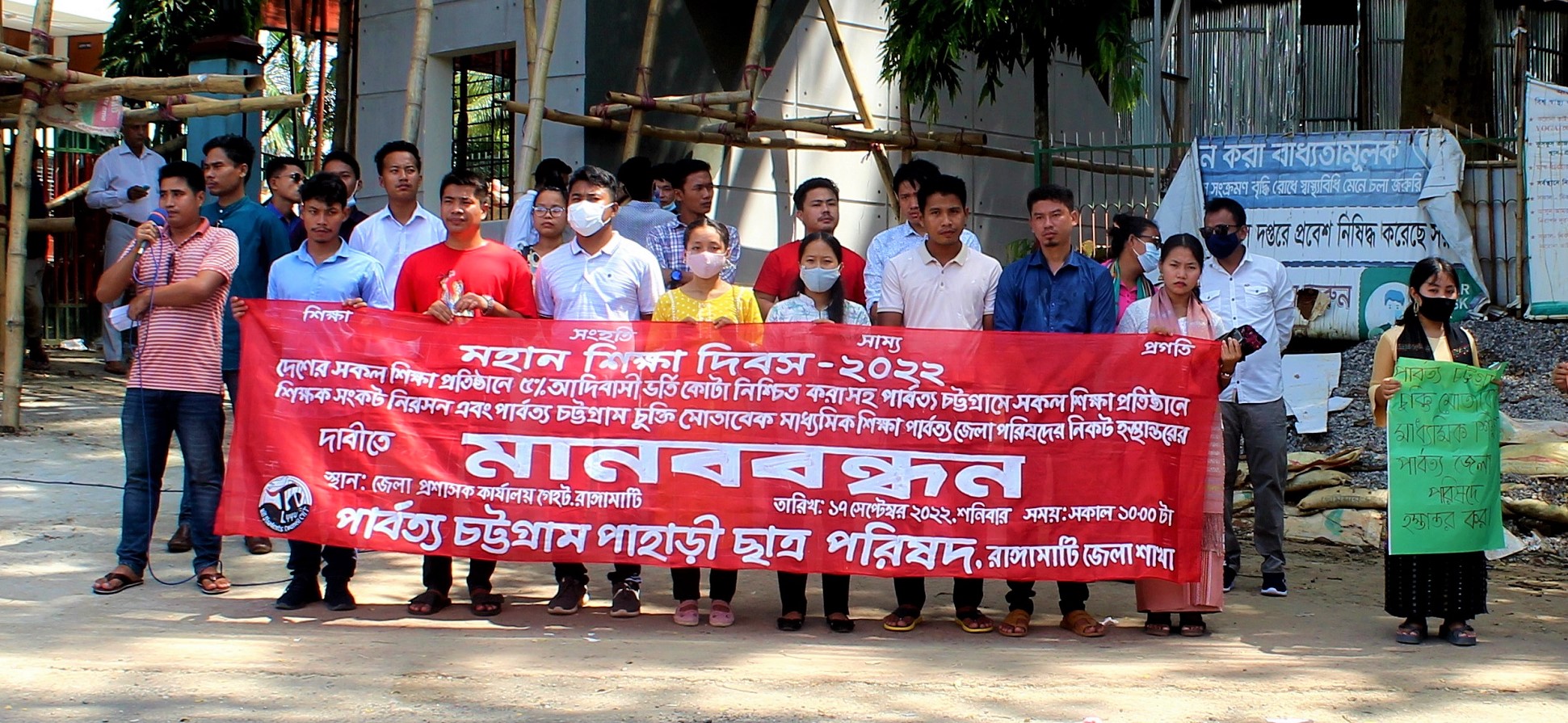 উক্ত মানববন্ধনে পিসিপি রাঙ্গামাটি জেলা শাখার সহ-সাধারণ সম্পাদক টিকেল চাকমার সঞ্চালনায় এবং পিসিপি রাঙ্গামাটি জেলা শাখার সহ-সভাপতি জিকো চাকমার সভাপতিত্বে স্বাগত বক্তব্য প্রদান করেন, পিসিপি রাঙ্গামাটি জেলা শাখার সহ-সাংগঠনিক সম্পাদক রনেল চাকমা। তিনি ১৯৬২ সালের ১৭ সেপ্টেম্বর ছাত্র সংগ্রাম পরিষদের ডাকা হরতালে পুলিশের গুলিতে যারা শহীদ হয়েছেন তাদের প্রতি শ্রদ্ধা জানান। তিনি বলেন, পার্বত্য চট্টগ্রামের শিক্ষাব্যবস্থা খুবই নাজুক। পার্বত্য চট্টগ্রাম চুক্তি অনুযায়ী পার্বত্য চট্টগ্রামের শিক্ষা ব্যবস্থাকে ঢেলে সাজাতে তিনি সরকারকে আহ্বান জানান।