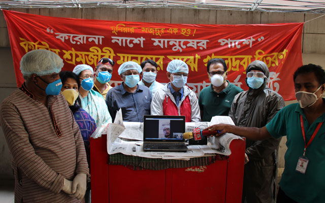 বাংলাদেশের ওয়ার্কার্স পার্টির সভাপতি কমরেড রাশেদ খান মেনন এমপি, আজ ‘করোনা নাশে মানুষের পাশে’ ওয়ার্কার্স পার্টি ঘোষিত দিন আনা দিন খাওয়া মানুষের মধ্যে খাদ্য বিতরণের এই কর্মসূচিতে ভিডিওর মাধ্যমে যুক্ত হয়ে উপস্থিতির সাথে কথা বলে তিনি বলেন, এই মুহূর্তে সব থেকে জরুরী প্রয়োজন অপ্রাতিষ্ঠানিক খাতে যে মানুষগুলো রয়েছে তাদের কাছে খাদ্য পৌঁছে দেয়া। যদি সামাজিক দুরত্ব বজায় রাখতে হয় তাহলে তাদের কাছে খাদ্য পৌঁছে দেয়া ছাড়া এই দুরত্ব বজায় রাখা সম্ভব হবে না। ইতোমধ্যে আমরা লক্ষ করেছি যে, মানুষ কাজ না পেয়ে তারা বাইরে চলে আসছে খাদ্যের সন্ধানে, এমনকি গার্মেন্টস শ্রমিকরা তাদের চাকরি বাঁচাতে দলে দলে ঢাকায় চলে আসছে। এই ধরনের সিদ্ধান্ত কত অবিবেচক ও কত অমানবিক সেটা আমাদের চোখের সামনে আমরা ঘটতে দেখলাম।