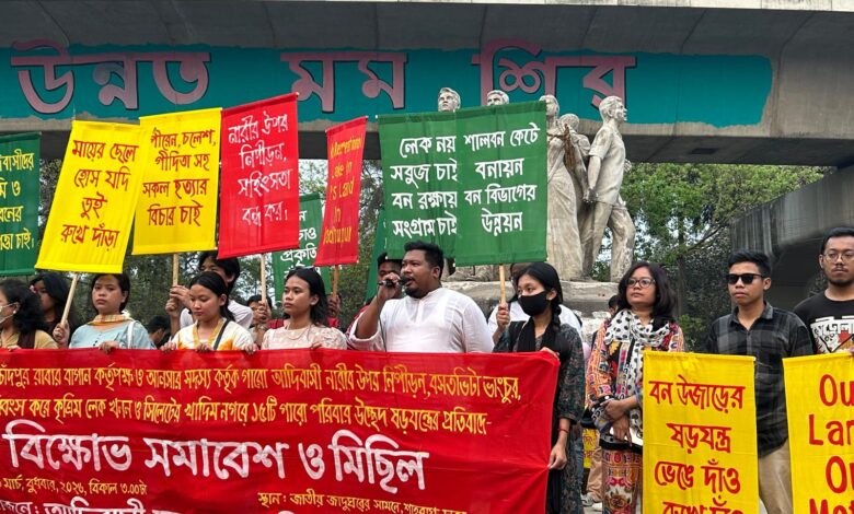 টাঙ্গাইলের মধুপুরে চাঁদপুর রাবার বাগান কর্তৃপক্ষ ও আনসার সদস্য কর্তৃক আদিবাসী নারী ও শিশুর উপর নিপীড়ন, বসতভিটা ভাঙচুর, প্রাণবৈচিত্র্য ধ্বংস করে কৃত্রিম লেক খনন ও সিলেটের খাদিমনগরে ১৫ টি গারো পরিবার উচ্ছেদ ষড়যন্ত্রের প্রতিবাদে আজ ১১ মার্চ বুধবার বিকেলে শাহবাগ জাতীয় জাদুঘরের সামনে বিক্ষোভ সমাবেশ ও মিছিল করেছে আদিবাসী ছাত্র যুব ও নারী সংগঠনসমূহ।