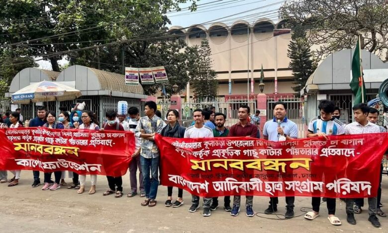 কুলাউড়ার ঝিমাই খাসিয়া পুঞ্জিতে গাছ কাটার প্রতিবাদে শাহবাগে মানববন্ধন