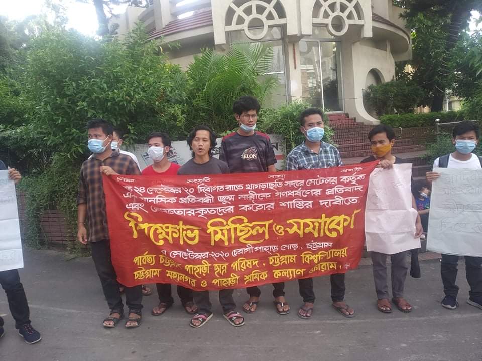 খাগড়াছড়ি সদর উপজেলায় ১ নং গোলাবাড়ি ইউনিয়ন সংলগ্ন বলপেয়্যে আদাম নামক গ্রামে নিজ বাড়িতে ৯ জন বাঙালি কর্তৃক এক মানসিক প্রতিবন্ধী জুম্ম নারীকে ধর্ষণের প্রতিবাদ এবং গ্রেফতারকৃত ধর্ষকদের শাস্তির দাবিতে আজ বিকাল তিনটায় চট্টগ্রাম চেরাগী পাহাড় মোড়ে বিক্ষোভ মিছিল ও সমাবেশ করেছে পার্বত্য চট্টগ্রাম পাহাড়ী ছাত্র পরিষদ । পাহাড়ী ছাত্র পরিষদের চট্টগ্রাম বিশ্ববিদ্যালয় শাখা, চট্টগ্রাম মহানগর শাখা ও পাহাড়ী শ্রমিক কল্যাণ ফোরামের যৌথ উদ্যোগে এই বিক্ষোভ মিছিল ও সমাবেশ অনুষ্ঠিত হয়।