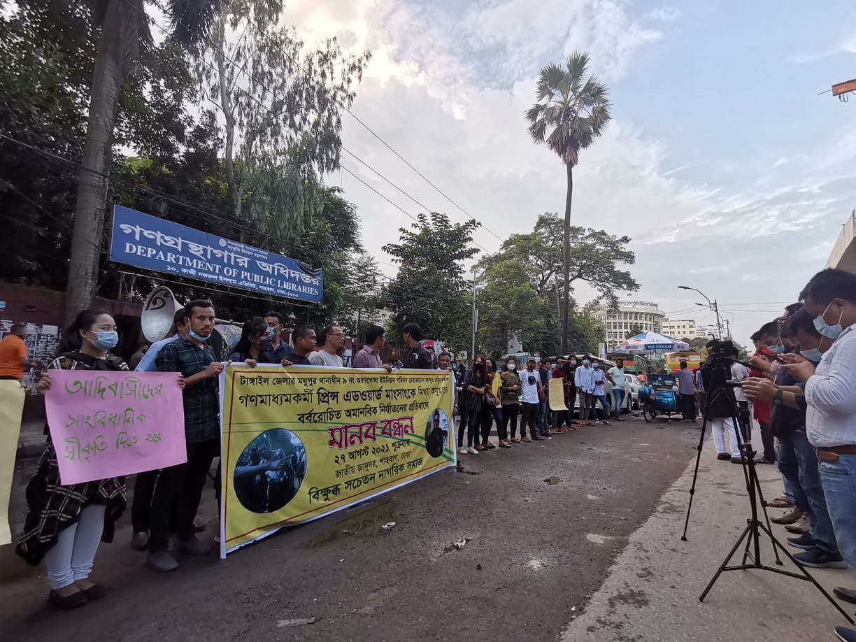 টাঙ্গাইলের মধুপুর উপজেলার গণমাধ্যম কর্মী প্রিন্স এডওয়ার্ড মাংসাং কে বর্বর নির্যাতনের প্রতিবাদে আহ ২৭আগস্ট ২০২১, শুক্রবার, বিকাল ৪.০০ টায় শাহবাগের জাতীয় জাদুঘরের সামনে একটি মানববন্ধন অনুষ্ঠিত হয়েছে। বিক্ষুব্ধ সচেতন নাগরিক সমাজের আয়োজনে অনুষ্ঠিত উক্ত মানববন্ধনে সভাপতিত্ব করেন ঢাকা ওয়ানগালার নকমা শুভজিৎ সাংমা।