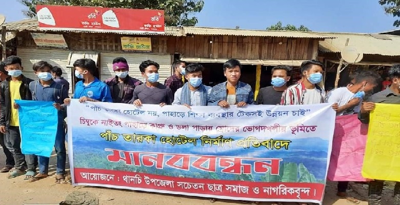 চিম্বুকে হোটেল নির্মাণ বন্ধের দাবিতে থানচিতে ছাত্র ও নাগরিকবৃন্দের মানববন্ধন