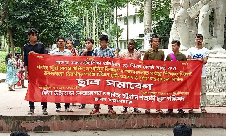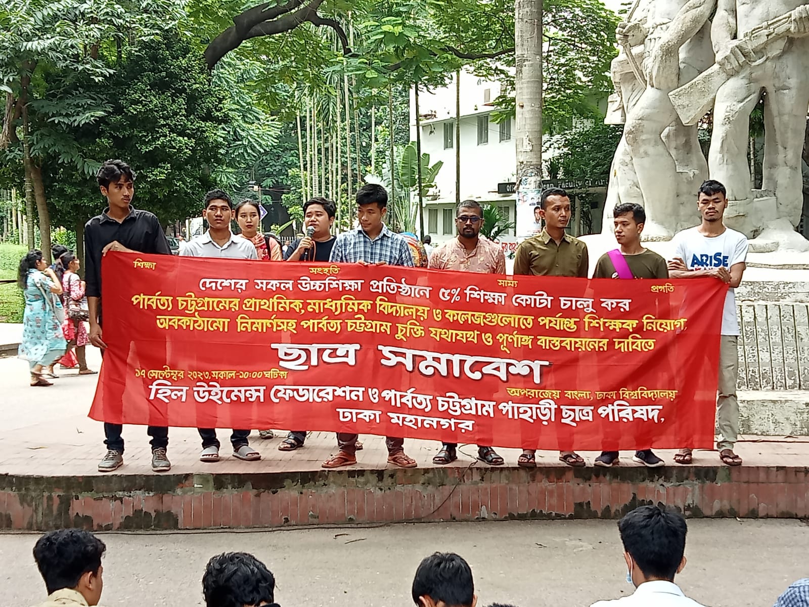 আজ ১৭ই সেপ্টেম্বর ২০২৩ ইং তারিখে মহান শিক্ষা দিবস। পার্বত্য চট্টগ্রাম পাহাড়ী ছাত্র পরিষদ, ঢাকা মহানগর শাখা ও হিল উইমেন্স ফেডারেশন, ঢাকা মহানগর কমিটির উদ্যোগে মহান শিক্ষা দিবস উপলক্ষে দেশের সকল উচ্চ শিক্ষা প্রতিষ্ঠানে ৫% শিক্ষা কোটা চালু করা সহ পার্বত্য চট্টগ্রামে প্রাথমিক, মাধ্যমিক ও কলেজগুলোতে পর্যাপ্ত ও দক্ষ শিক্ষক নিয়োগ, অবকাঠামো উন্নয়ন এবং পার্বত্য চট্টগ্রাম চুক্তির য়থাযথ ও পূর্ণাঙ্গ বাস্তবায়নের দাবিতে ঢাকা বিশ্ববিদ্যালয়ের কলাভবনের, অপরাজেয় বাংলার পাদদেশে ছাত্র সমাবেশের আয়োজন করা হয়।