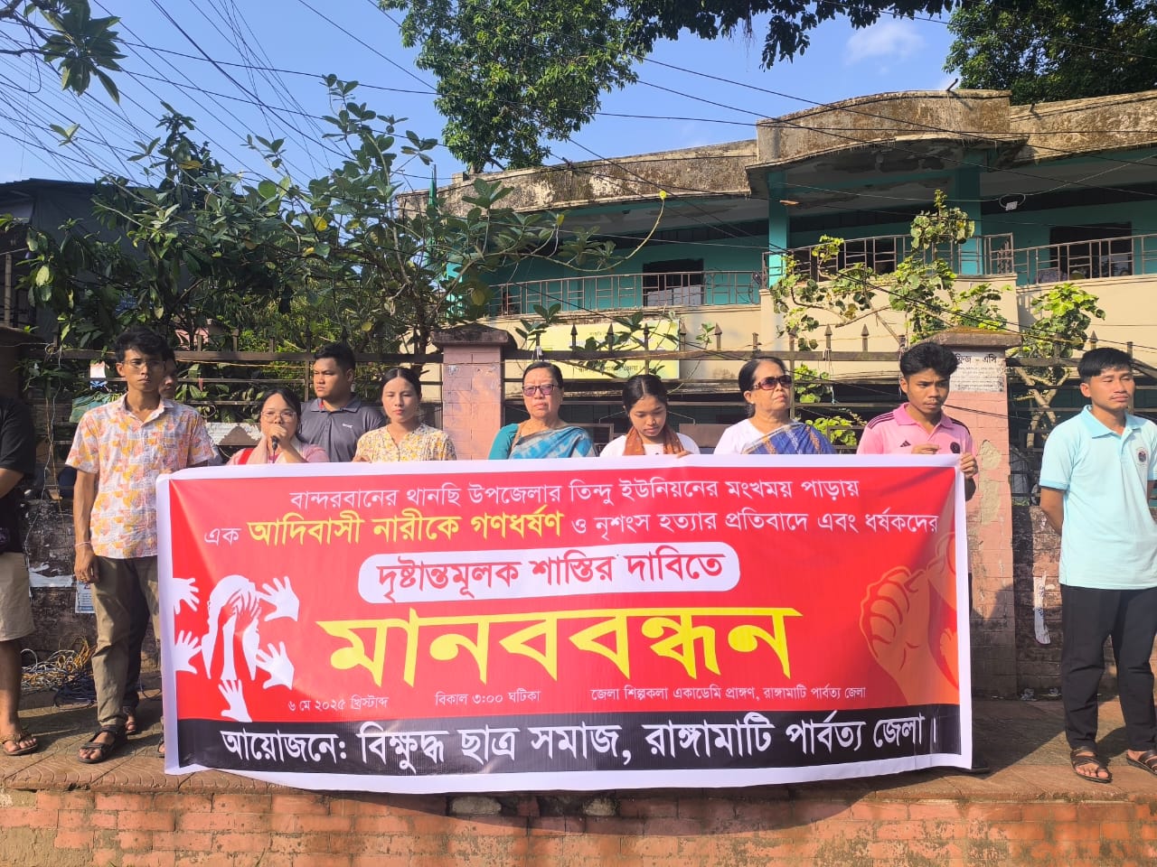 থানচিতে এক খেয়াং নারীকে ধর্ষণ ও নির্মমভাবে হত্যার প্রতিবাদে রাঙামাটিতে মানববন্ধন অনুষ্ঠিত