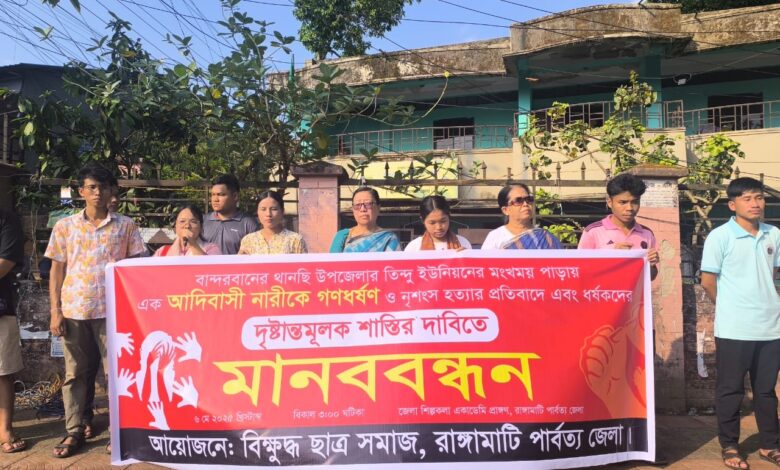 থানচিতে এক খেয়াং নারীকে ধর্ষণ ও নির্মমভাবে হত্যার প্রতিবাদে রাঙামাটিতে মানববন্ধন অনুষ্ঠিত