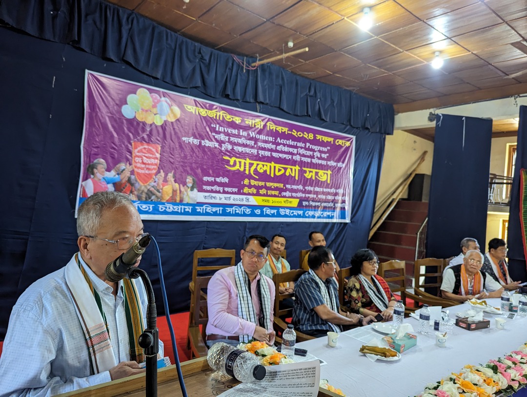 প্রধান অতিথির বক্তব্যে পার্বত্য চট্টগ্রাম জনসংহতি সমিতি কেন্দ্রীয় কমিটির সহসভাপতি শ্রী ঊষাতন তালুকদার বলেন, পাহাড়ী নারীদের জীবনমান বিকাশে রাষ্ট্রকে কর্মপরিকল্পনা নিতে হবে। সমাজ বিকাশের ধারাবাহিকতায় নারীদের অবদান অনস্বীকার্য। পুরুষতান্ত্রিক সমাজে নারীরা তেমন সুযোগ সুবিধা পায় না আদিবাসী সমাজে নারীরা পুরুষদের পাশাপাশি অনেক কাজ করে। পাহাড়ের নারীরা জুম চাষ, সন্তান লালন পালন করা সহ সমাজের বিভিন্ন ক্ষেত্রে অবদান রাখে, পাহাড়ী নারীরা নিজেদের কাপড় চোপড় বুনতে পারে কিন্তু সেটালারদের আগ্রাসনে পাহাড়ী নারীরা অনিরাপদ জীবন কাটাচ্ছে। রাষ্ট্রের বৈষম্যমূলক আচরণের কারণে পাহাড়ী নারীরা বার বার বঞ্চনার শিকার হচ্ছে। দেশের নানা পর্যায়ে পাহাড়ী নারীরা ভূমিকা রাখছে।পাহাড়ী নারীদের ভাগ্য পরিবর্তনের রাষ্ট্রের সহযোগিতা প্রয়োজন। পার্বত্য চুক্তি বাস্তবায়িত হলে পাহাড়ী নারীরা দেশের উন্নয়নে বেশি ভূমিকা রাখতে পারবে।