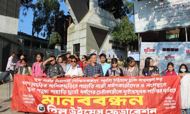 পাহাড়ি নারী ধর্ষণকারীদের দৃষ্টান্তমূলক শাস্তির দাবিতে রাঙ্গামাটিতে হিল উইমেন্স ফেডারেশনের মানববন্ধন