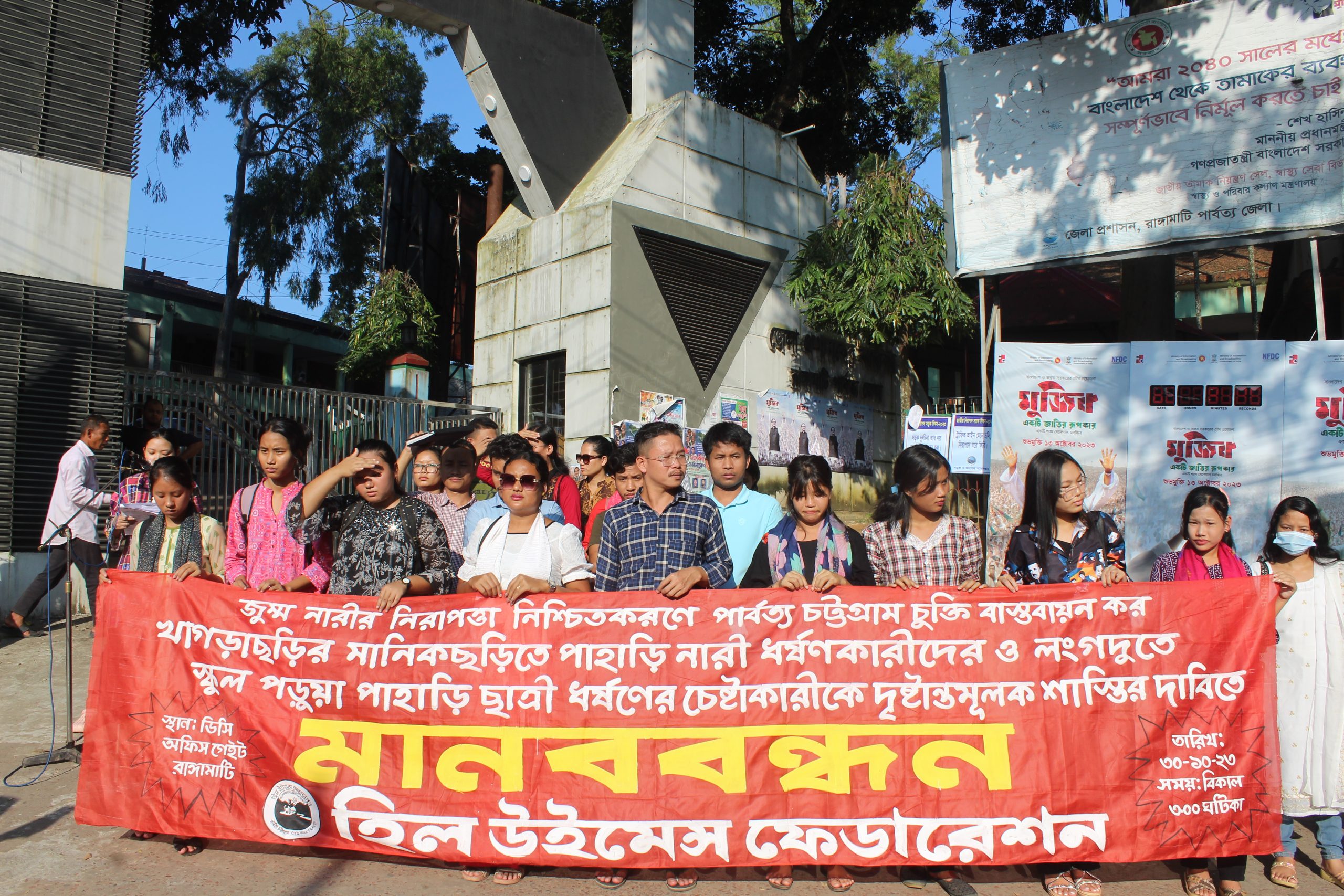 গতকাল ৩০ অক্টোবর রবিবার বিকালে খাগড়াছড়ির মানিকছড়িতে পাহাড়ি নারী ধর্ষণ ও লংগদুতে স্কুল পড়ুয়া পাহাড়ি ছাত্রী ধর্ষণের চেষ্টাকারীকে দৃষ্টান্তমূলক শাস্তির দাবিতে হিল উইমেন্স ফেডারেশনের উদ্যোগে ডিসি অফিস প্রাঙ্গণে মানববন্ধন অনুষ্ঠিত হয়।