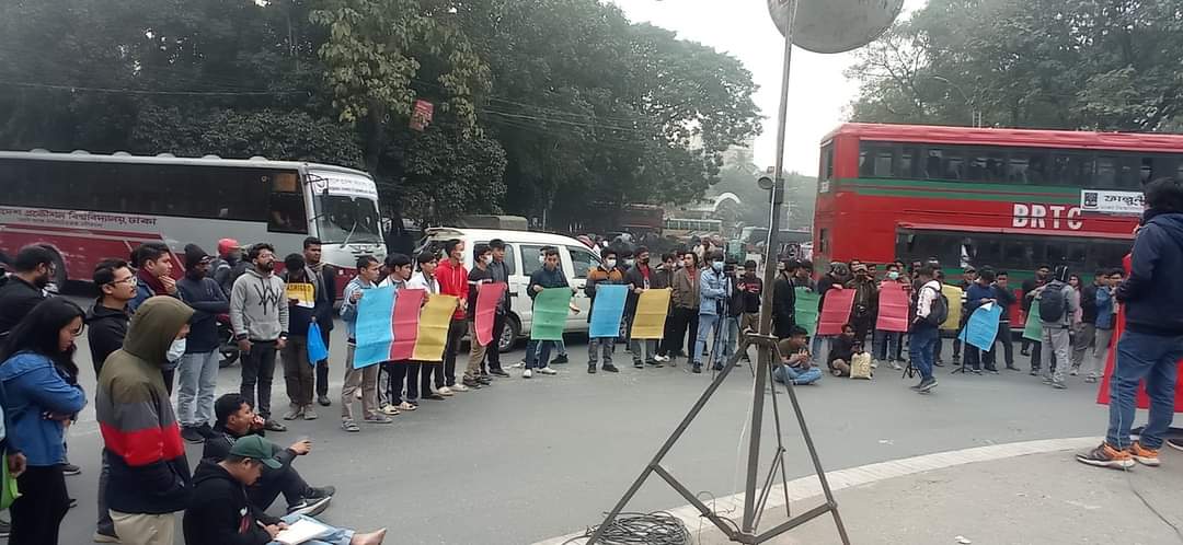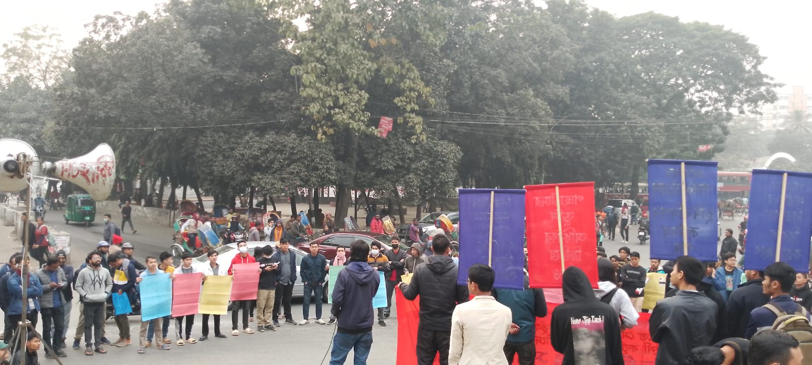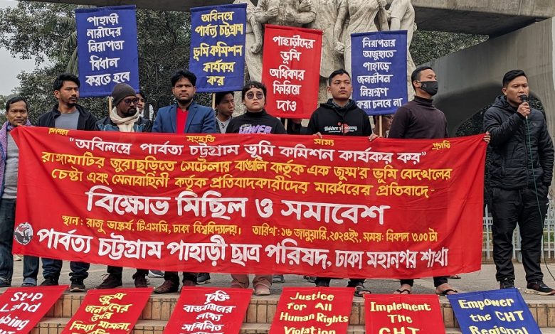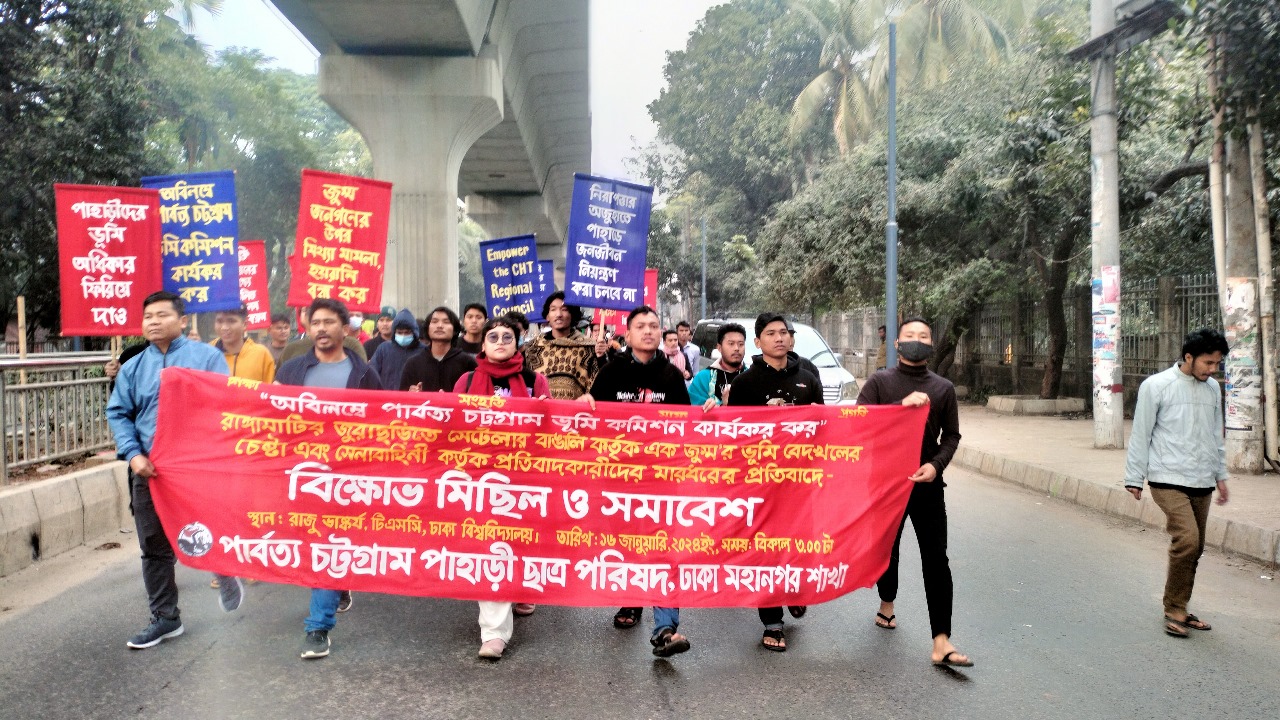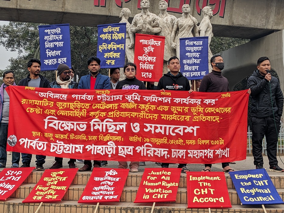 আজ ১৬ জানুয়ারি ২০২৪ ইং, রোজ: মঙ্গলবার, বিকাল: ০৩:০০ টায় রাঙ্গামাটির জুরাছড়িতে সেটেলার বাঙালি কর্তৃক এক জুম্ম’র ভূমি বেদখলের অপচেষ্টা এবং সেনাবাহিনী কর্তৃক প্রতিবাদকারীদের মারধরের প্রতিবাদে পার্বত্য চট্টগ্রাম পাহাড়ী ছাত্র পরিষদ, ঢাকা মহানগর শাখা একটি বিক্ষোভ মিছিল ও প্রতিবাদ সমাবেশ আয়োজন করেছে। “বাংলাদেশের ফিলিস্তিন, সিএইচটি’র খবর নিন” সহ নানা স্লোগানে মিছিলটি ঢাকা বিশ্ববিদ্যালয়ের টিএসসি’র রাজু ভাষ্কর্য থেকে শুরু হয়ে রোকেয়া হল হয়ে কলাভবন প্রদক্ষিণ করে সমাজ বিজ্ঞান ভবন পেরিয়ে আবার রাজু ভাষ্কর্যে এসে শেষ হয়। পরে সেখানে সমাবেশ অনুষ্ঠিত হয়। সমাবেশে পিসিপি, ঢাকা মহানগর শাখার সভাপতি জগদীশ চাকমার সভাপতিত্বে ও সংগঠনটির সাধারণ সম্পাদক শুভ চাকমার সঞ্চালনায় বক্তব্য রাখেন বিভিন্ন সংগঠনের নেতৃবৃন্দ।