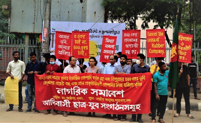 আজ সোমবার (৩১ অক্টোবর) বিকেলে শাহবাগের জাতীয় জাদুঘরের সামনে আদিবাসী ছাত্র ও যুব সংগঠনগুলোর আয়োজনে অনুষ্ঠিত সমাবেশে লিখিত বক্তব্যে আদিবাসী ফোরামের দপ্তর সম্পাদক মনিরা ত্রিপুরা বলেন, গত ২৭ এপ্রিল লামার সরই ইউনিয়নে রেংয়েন ম্রো কার্বারি পাড়া, লাংকম ম্রো কার্বারি পাড়া, জয়চন্দ্র ত্রিপুরা কার্বারি পাড়া- এই তিন গ্রামের ৪০০ একর জুমভূমি, ফলজ বাগান ও বন পুড়িয়ে দেয় লামা রাবার ইন্ডাস্ট্রিজ লিমিটেড। এ ঘটনায় জড়িত লামা রাবার কোম্পানির কামাল উদ্দিন, মোয়াজ্জেম হোসেনকে শাস্তির আওতায় আনা হয়নি। বরং বিভিন্নভাবে উচ্ছেদের চিন্তা করছেন। তিন গ্রামের ৩৯ টি পরিবারের প্রায় দুই শতাধিক মানুষকে উচ্ছেদের ষড়যন্ত্র করা হচ্ছে। বাংলাদেশ আদিবাসী ফোরামের তথ্য ও প্রচার সম্পাদক দীপায়ন খীসা আরো বলেন, বারবার আগুন দেয়া হচ্ছে, পানিতে বিষ দেয়া হচ্ছে, আম বাগান কাটা হচ্ছে। এসবকিছু দিনদুপুরে প্রকাশ্যে হচ্ছে। আমরা যুগের পর যুগ, পজন্মের পর প্রজন্ম এখানে বাস করে যাচ্ছি। আজ আমাদের বলা হচ্ছে কাগজ পত্র দেখাতে হবে। এখন মনে হচ্ছে সরকার ক্ষমতায় নেই আছে দখলদারিত্বরা। সরকার বলছেন দুর্ভিক্ষ হবে। এদিকে তাদের বাগানের গাছ কেটে দেয়া হচ্ছে তাহলে কি লামার গ্রামবাসীরা রাবার খাবেন। তাদের বাগান কেন কেটে দিচ্ছেন।