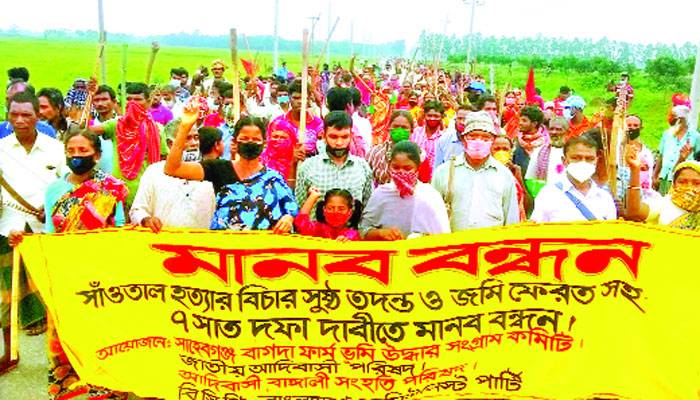 সাঁওতাল হত্যার বিচারসহ সাত দাবিতে মানববন্ধন