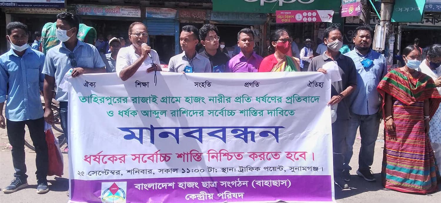 সুনামগঞ্জ জেলার তাহিরপুরের রাজাই গ্রামে এক আদিবাসী হাজং নারীকে ধর্ষণের প্রতিবাদে ও ধর্ষকের দ্রুত সর্বোচ্চ শাস্তির দাবিতে ২৫ সেপ্টেম্বর শনিবার ১১ টায় সুনামগঞ্জের ট্রাফিক পয়েন্টে একটি মানববন্ধনের আয়োজন করে বাংলাদেশ হাজং ছাত্র সংগঠন, বাহাছাস কেন্দ্রীয় পরিষদ। রাজাই গ্রাম ও অন্যান্য অঞ্চল থেকে অর্ধশতাধিক আদিবাসী ও বাঙালি নারী-পুরুষ এ মানববন্ধনে অংশ নেয়।